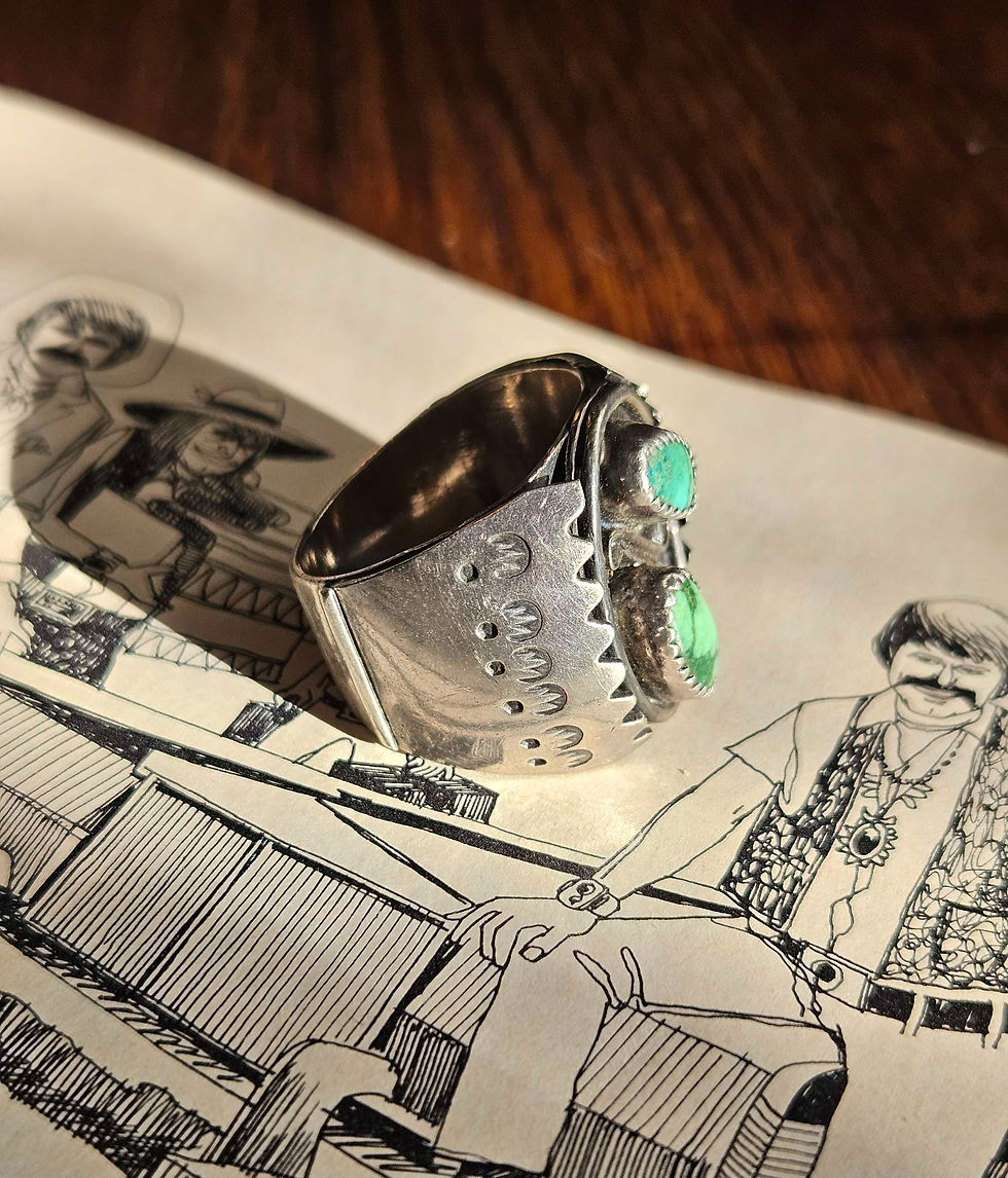 Vintage Annie Cowboy Navajo Sterling, Turquoise & Coral Watch Cuff